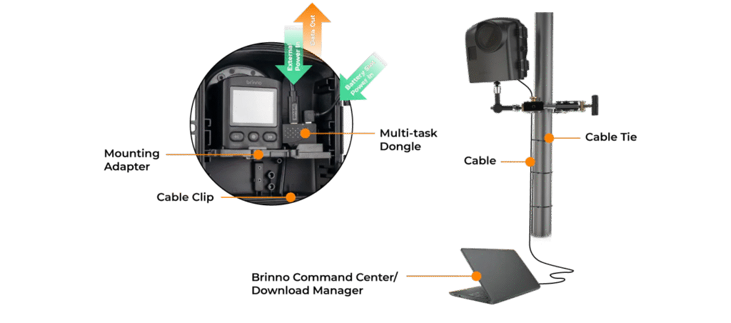 Give yourself a boost. With the 32ft (10m) long cable get instant access to your camera. Download files onto your laptop and use the new Brinno Command Center to modify camera controls and check filming and battery status. For a truly flexible installation experience, the cable can also be used to connect your camera to external power through a power adapter.
