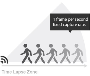 Hybrid Mode consists of time lapse + motion detection, the camera switches from 1 frame per second Time Lapse Mode to Motion Mode (2-3 images per second for 5 seconds) when a moving object enters the 20 feet motion zone.