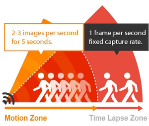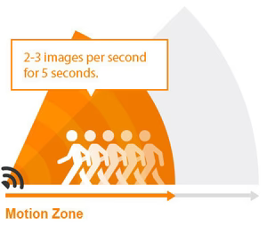 In Motion Mode, when the PIR motion sensor is triggered by any movement in a 20 feet zone, the camera captures 2-3 images per second for 5 seconds
