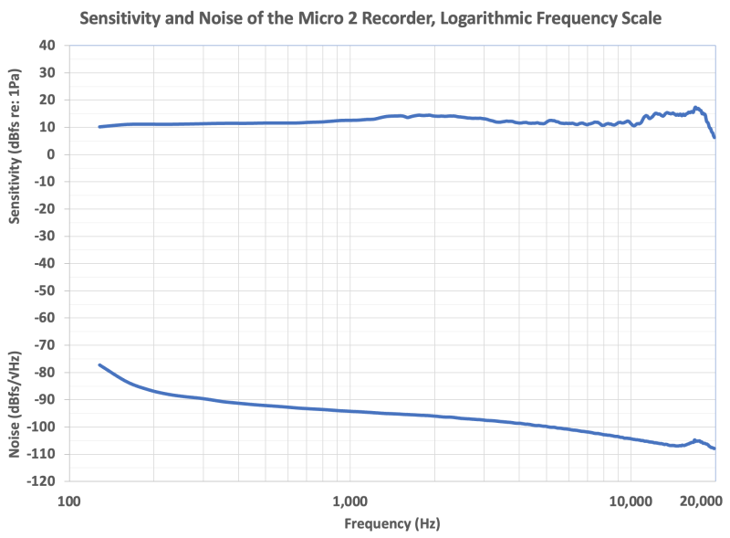 The following charts reflect default gain (+18 dB), 48 kHz sample rate, calibrated sound source one meter from the recorder, perpendicular to microphone axis.